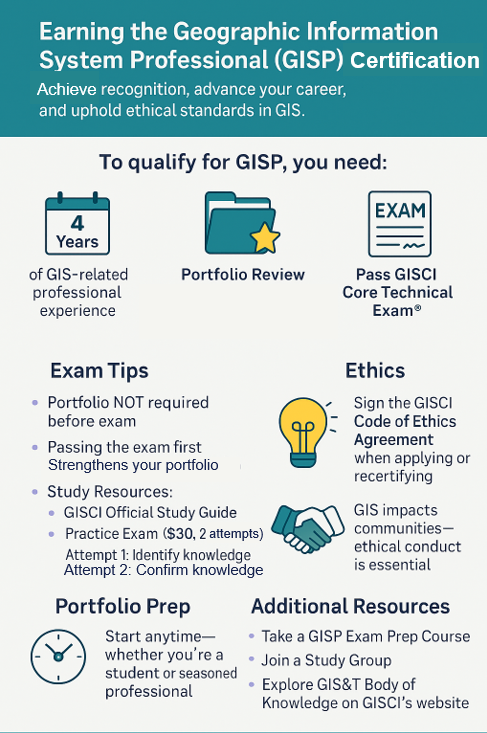 Geographic Information System Professional (GISP) Certification InformationObtaining a GISP certification is an excellent way to deepen your knowledge of Geographic Information Systems (GIS) and advance your career. To qualify for the GISP designation, you must meet the following requirements: